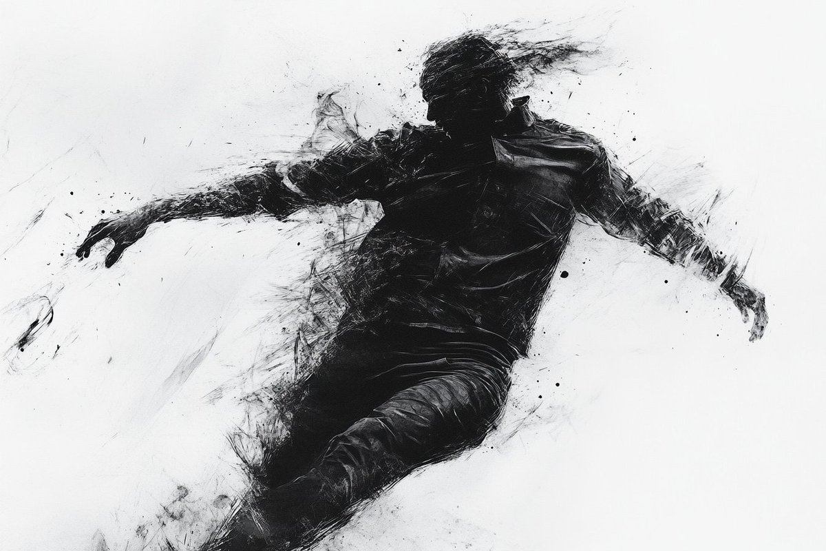 The result is a monochrome image where the darkest areas are dense and chaotic, almost like the aftermath of an explosion frozen in time. Highlights emerge from erasing charcoal layers, giving the sensation of light piercing through smoke and dust. The smudges don’t feel random but rather purposeful, guiding the eye across the composition with a natural flow.