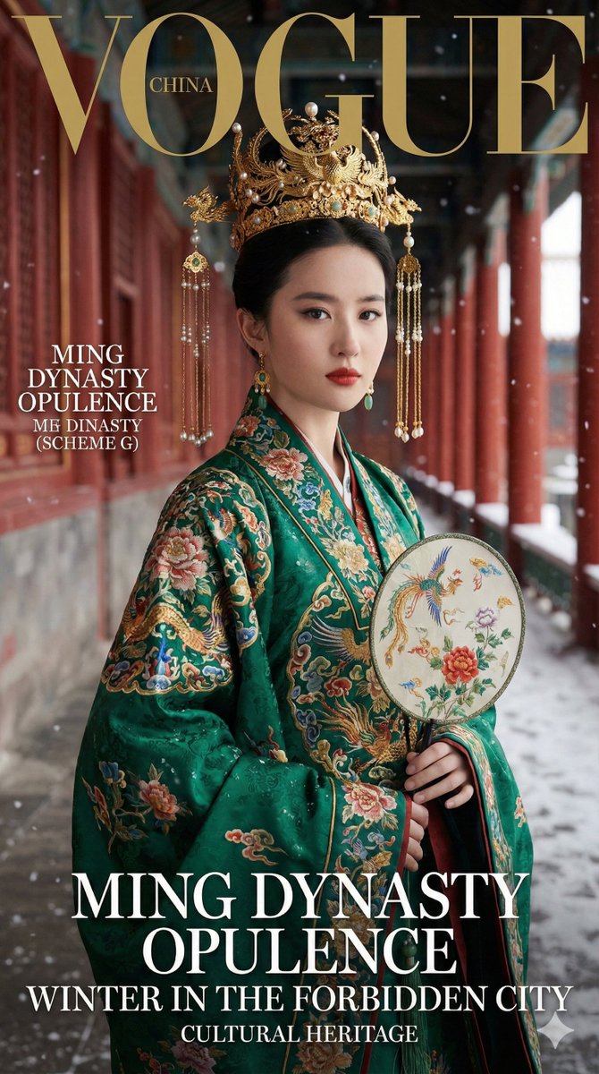 Hanfu has always fascinated me, but combining it with the grandeur of the Forbidden City felt like the ultimate creative challenge. I wanted to push AI image generation to create a Vogue-style magazine cover featuring traditional Ming dynasty formal wear, layered with intricate golden embroidery and heavy jewelry. The goal was to capture not just the look, but the regal spirit of the palace itself.